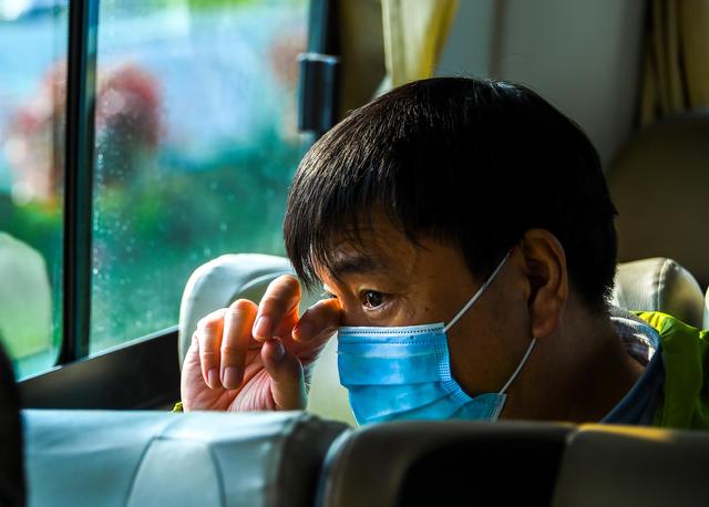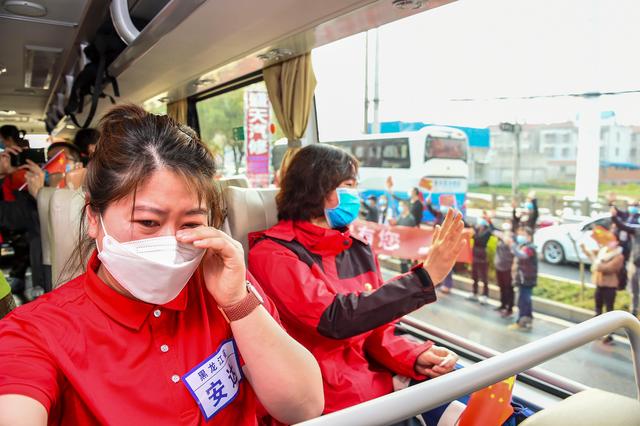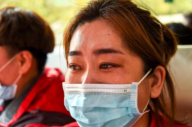 3月21日,一名黑龙江医疗队员乘坐大巴离开汉川市,不禁落泪。