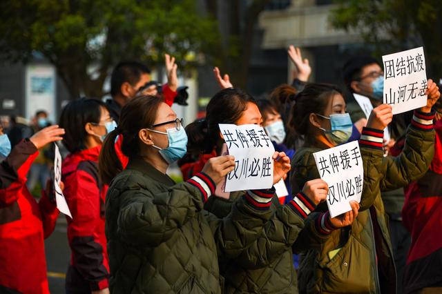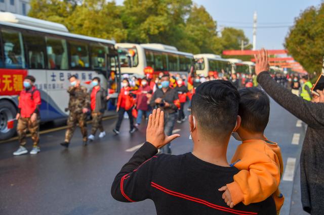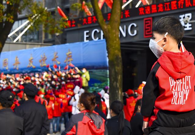 3月21日,在湖北省汉川市,一对父子在街边向即将登车的黑龙江医疗队员挥手致意。