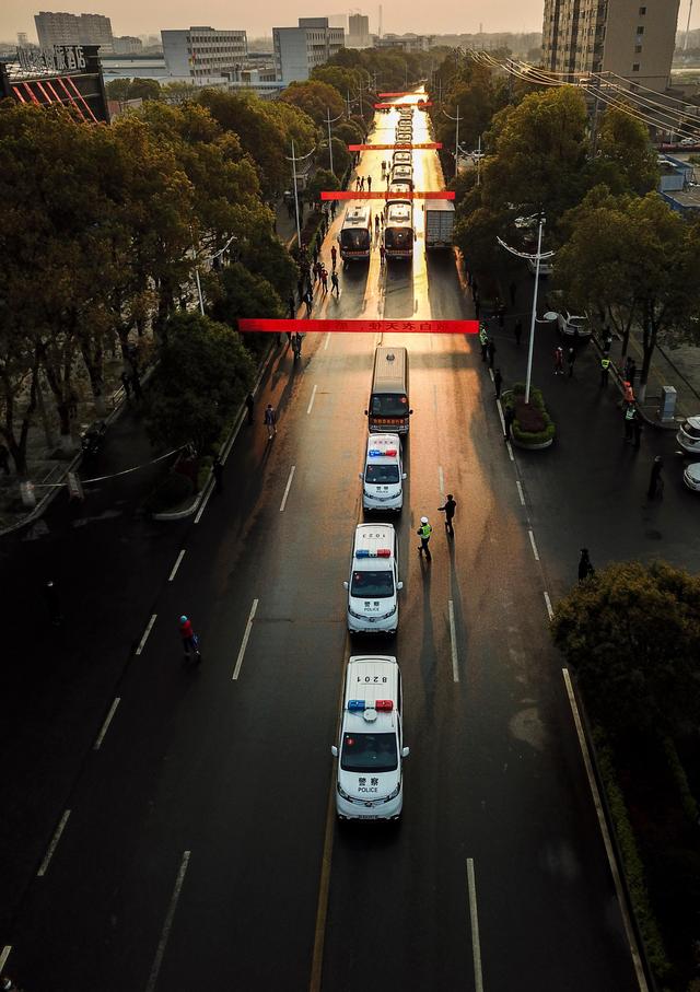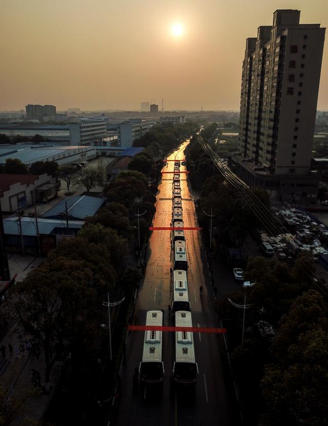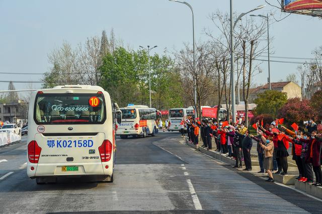 3月21日,载有黑龙江医疗队员的大巴车队行驶在汉川市,沿途市民前来送行。