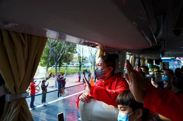 3月21日,黑龙江医疗队员向前来送行的汉川市民挥手告别。