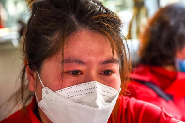 3月21日,一名黑龙江医疗队员乘车离开汉川时擦拭眼泪。