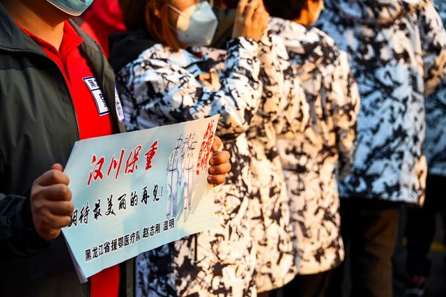 3月21日,一名黑龙江医疗队员在湖北省汉川市的告别仪式上,向前来送行的市民展示祝福语。