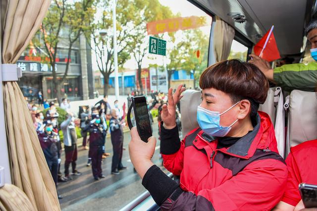3月21日,在湖北省汉川市,一名黑龙江医疗队员在拍摄离别场景。