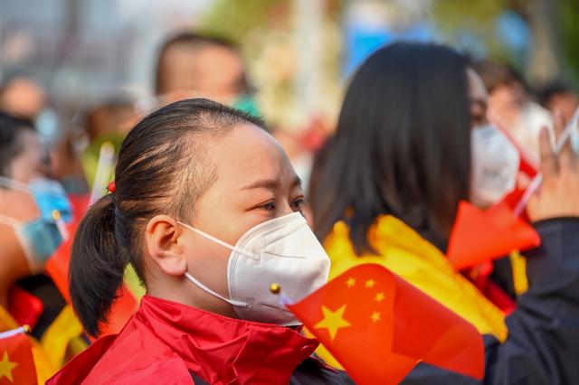 3月21日,黑龙江医疗队员彭晗在湖北省汉川市的告别仪式上擦拭眼泪。当日,黑龙江省对口支援湖北省孝感市的医疗队全体返程。医疗队分别从汉川市、应城市、安陆市离开,前往武汉天河机场。新华社记者胡虎虎摄影报道