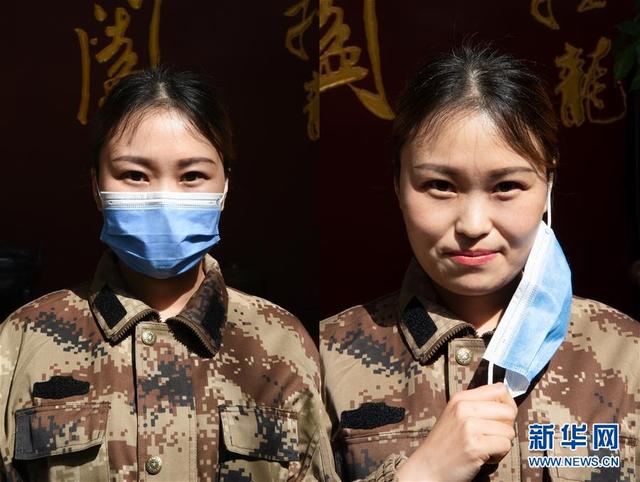 宁夏支援湖北襄阳医疗队队员邹礼丽离开襄阳前摘下口罩露出笑容(拼版照片,3月20日摄)。 新华社发(谢剑飞 摄)