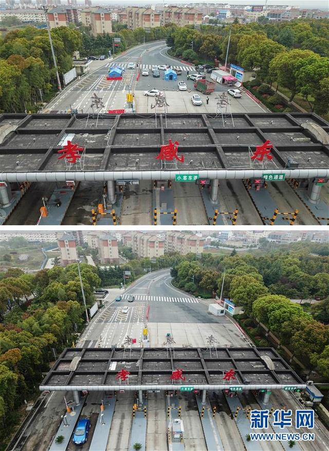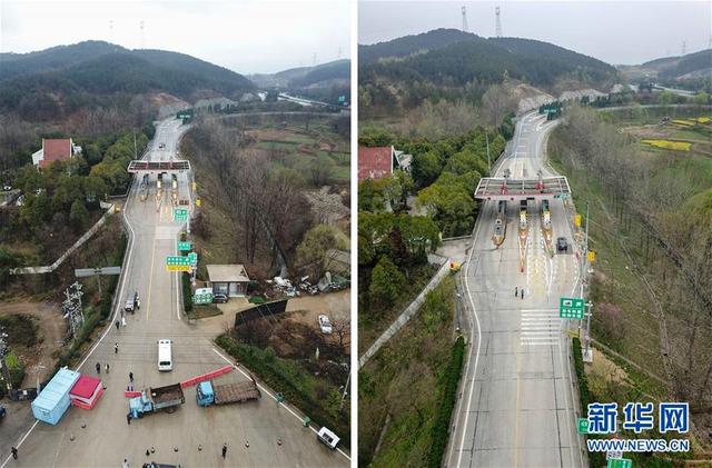 拼版照片:左图为解除管控措施之前的京港澳高速大新出入口(无人机照片,2月28日摄);右图为3月25日拍摄的京港澳高速大新出入口(无人机照片)。从3月25日零时起,湖北省除武汉市以外地区解除离鄂通道管控,有序恢复对外交通,离鄂人员凭湖北健康码“绿码”安全有序流动。 新华社记者胡虎虎 摄