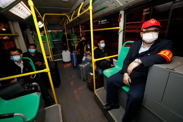 ↑3月25日,在武昌火车站综合体站始发的首趟518路公交车上,安全员给乘客测量体温。