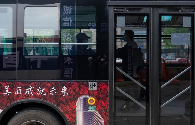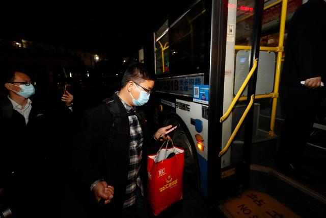 ↑3月25日,在武昌火车站综合体站始发的首趟518路公交车上,乘客用手机扫码实名登记后上车。