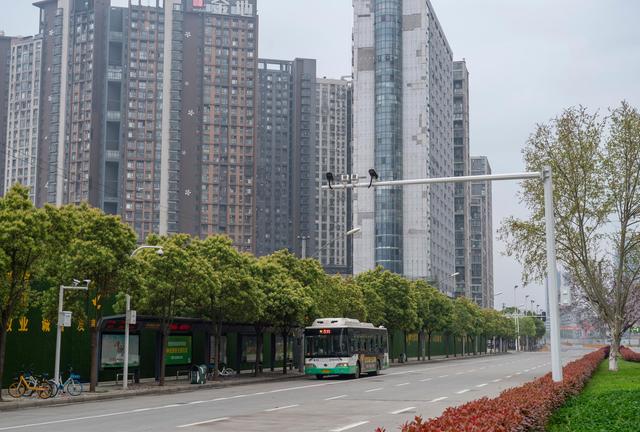 ↑3月25日,在武汉青山区和平大道和平公园公交站,511路公交车行驶在路上。