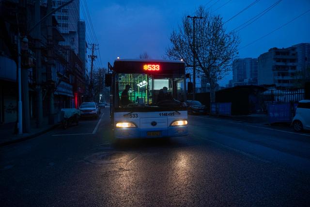 ↑3月25日,在武汉汉口火车站附近,首班533路公交车行驶在路上。