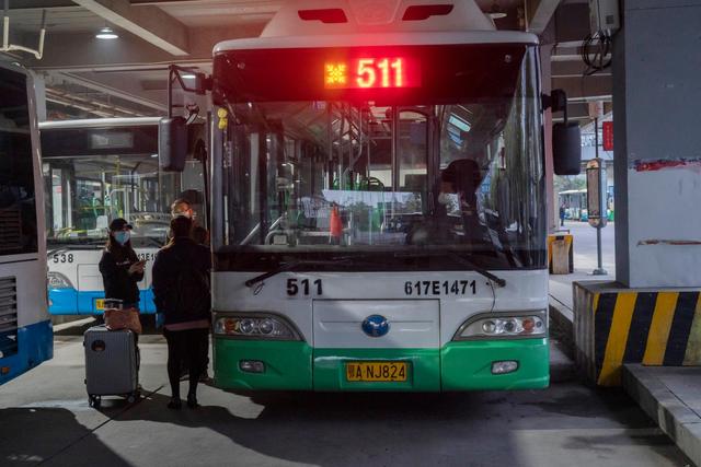 ↑3月25日,在武汉武昌火车站综合体站,乘客准备登上511路公交车。