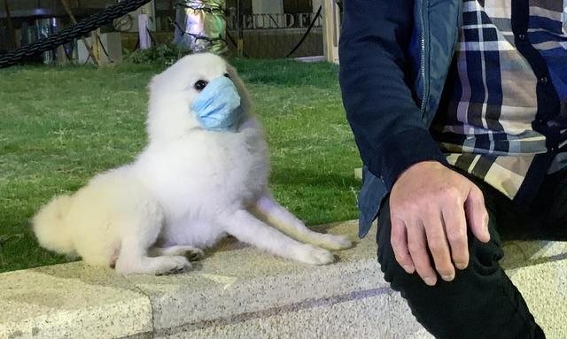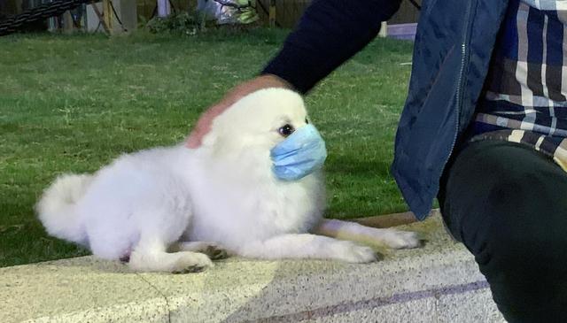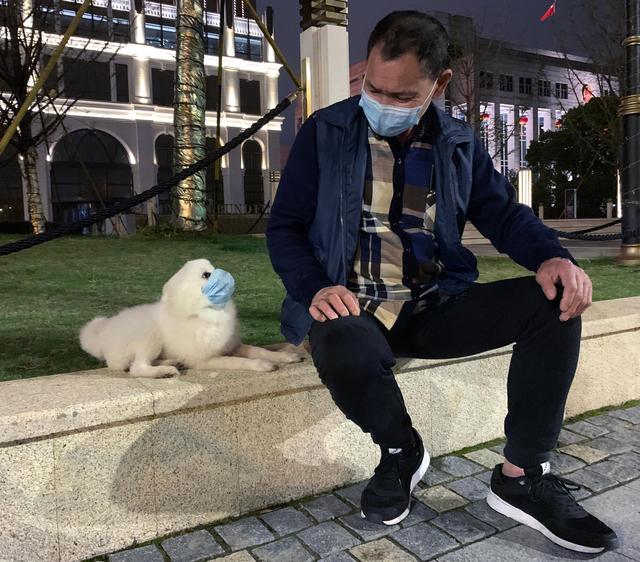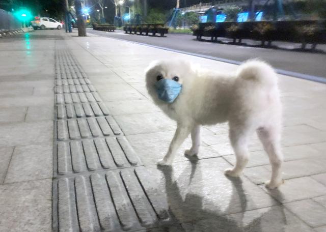 人们在疫情期间没有忘记他们可爱的宠物,一名武汉市民遛狗时也给他的小狗“妙妙”戴上了口罩,说可以避免它舔到脏东西。