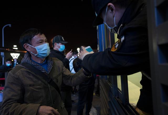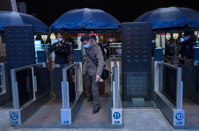↑4月7日晚,从长沙来武汉探亲后一直滞留在武汉的旅客刘先生在武昌火车站进站时向工作人员出示健康码,准备乘坐K81次列车离开武汉。