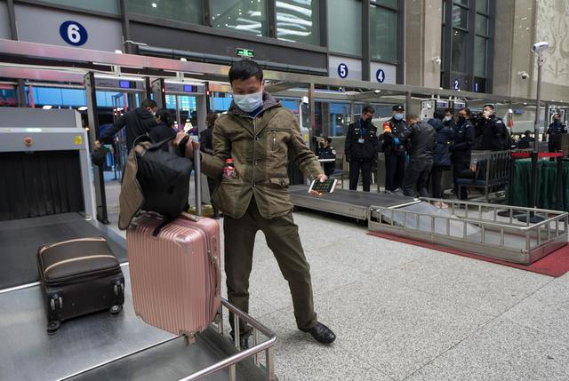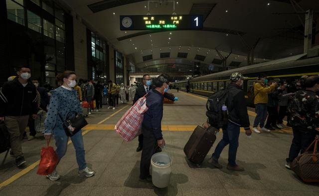 ↑4月7日晚,从长沙来武汉探亲后一直滞留在武汉的旅客刘先生进入武昌火车站,准备乘坐K81次列车离开武汉。