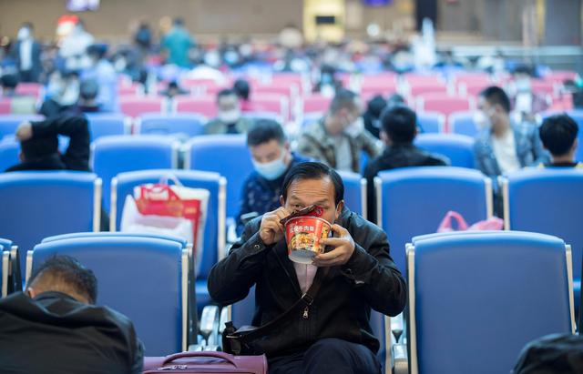 ↑4月7日晚,在武昌火车站,准备乘坐K81次列车离开武汉的一名乘客在候车室吃方便面。