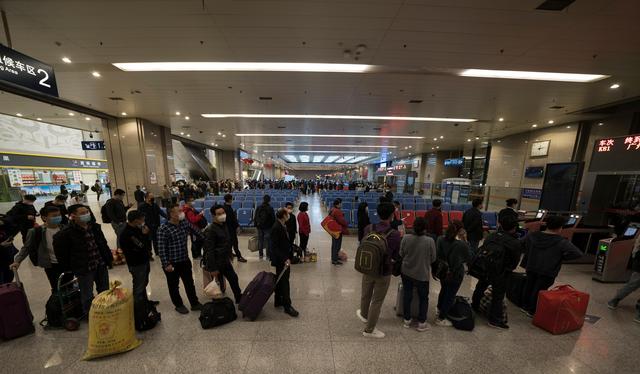 ↑4月8日凌晨,乘坐K81次列车的旅客在武昌火车站候车室排队进站。