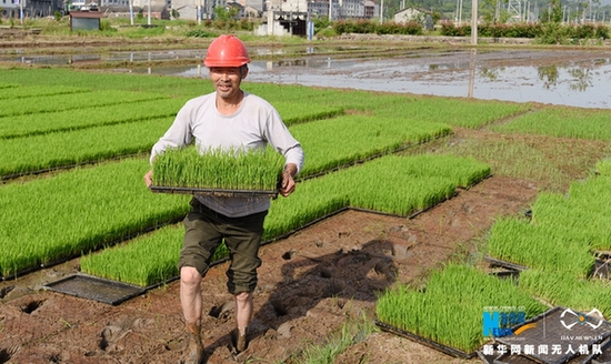 图为农户正在将培育好的水稻秧苗运往插秧的田里。新华网发 王华斌摄