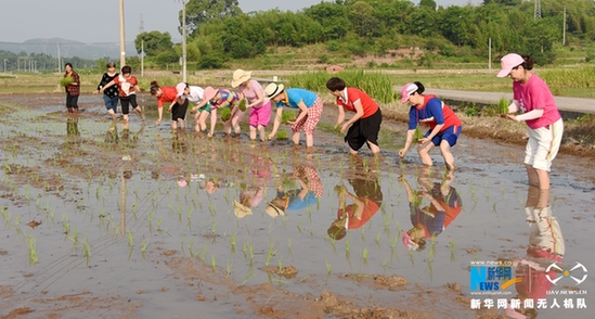 图为农户们正在水稻田里插秧。新华网发 王华斌摄