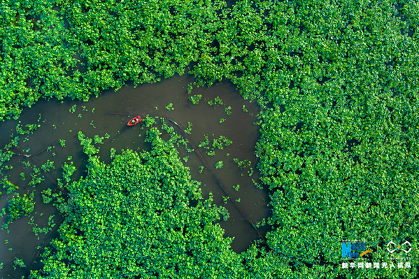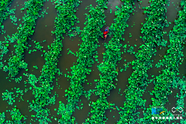 农民在荷田里劳作,像一颗红宝石镶嵌在万绿丛中。新华网发(张维堂 摄)