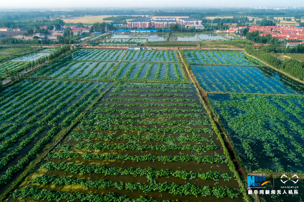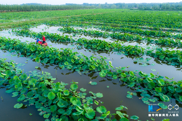 地处黄河南岸的天鹅湖村,荷田连连。新华网发(张维堂 摄)