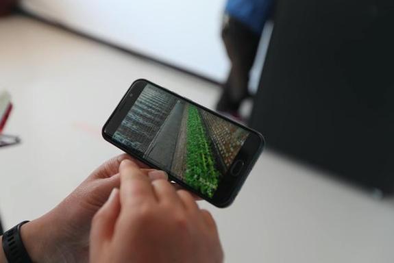 这是示范园里引进的科技扶贫物联网,全县16个扶贫产业园区全部纳入。打开手机APP,点开一个个小红点,就能全盘掌握各园区的棚内温湿度、当天雨量、风速等实时情况。更神奇的是,系统还能直接查果看菜。点进盛丰农业科技园区二号棚,放大画面,生菜的叶脉都清晰可见。这是通过各园区安装的摄像头及传感器,实时将生产区图像及相关参数传送到平台。