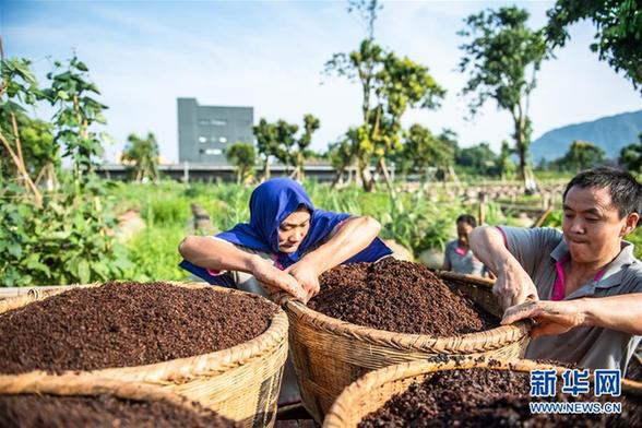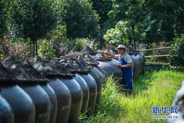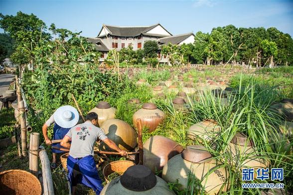 “赤水晒醋”采用固体发酵繁殖产生天然醋酸菌,醋醅和成品醋都在日光下曝晒而成,故称晒醋?!俺嗨勾住敝谱骼酚凭茫ば蚩季?,2009年被列入贵州省级非遗名录。新华社记者 陶亮 摄
