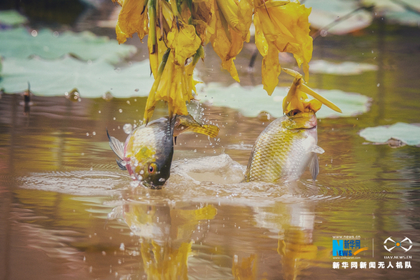 鱼儿腾空跳跃,激起一湖的涟漪。新华网发(刘锦辉 摄)