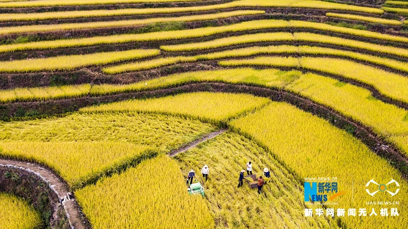 图为高山冷水稻进入收割期,田间地头一派繁忙。新华网发(郑家裕摄)