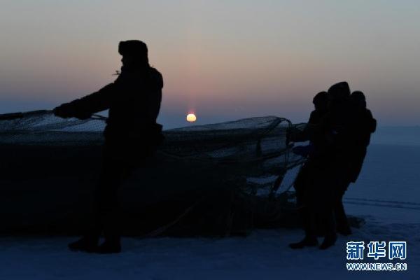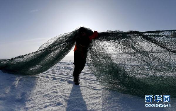 12月27日,渔工们在乌伦古湖将捕到的鱼抛至冰面,出水的鱼很快被冷冻。