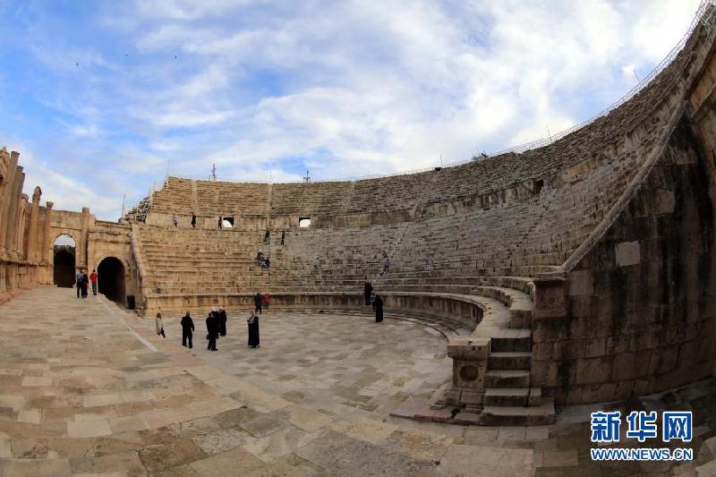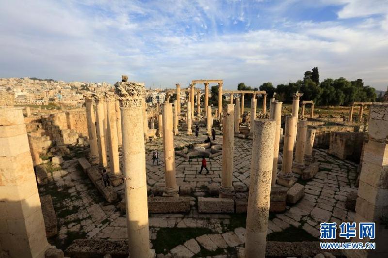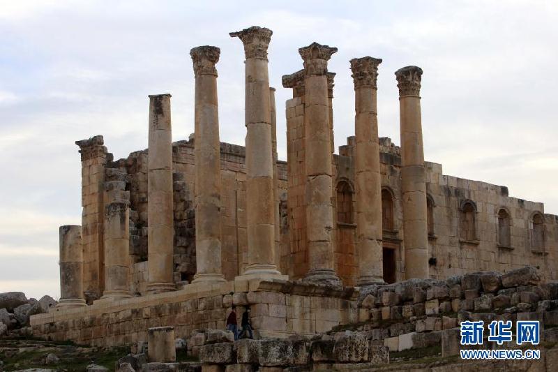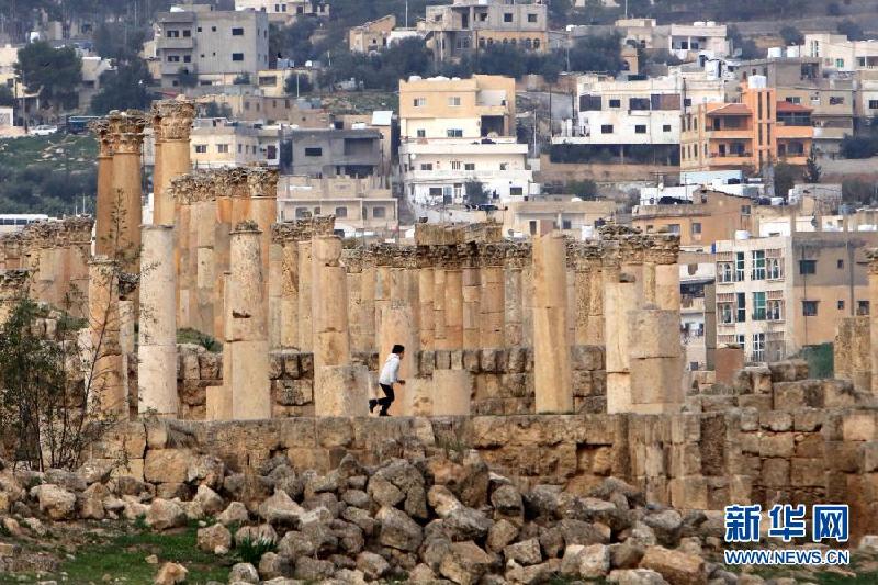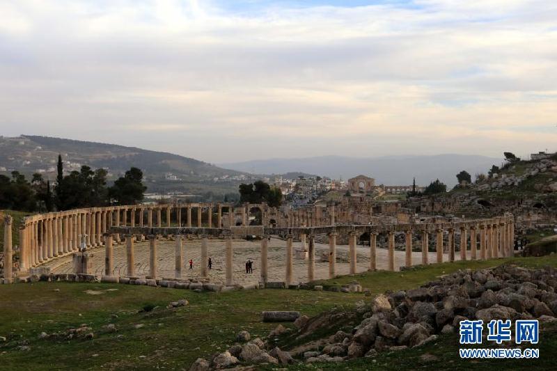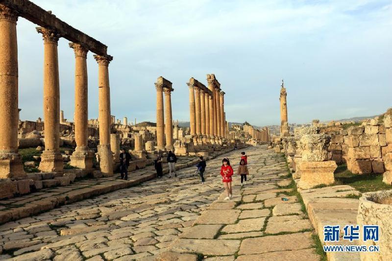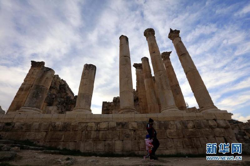 1月26日,游客参观约旦杰拉什古城。约旦首都安曼以北的杰拉什古城内剧场、神殿、集市、浴场、街道和供水系统等城市基础设施一应俱全,是约旦境内保存最完好的古罗马城市之一。新华社发(穆罕默德·阿布·古什摄)