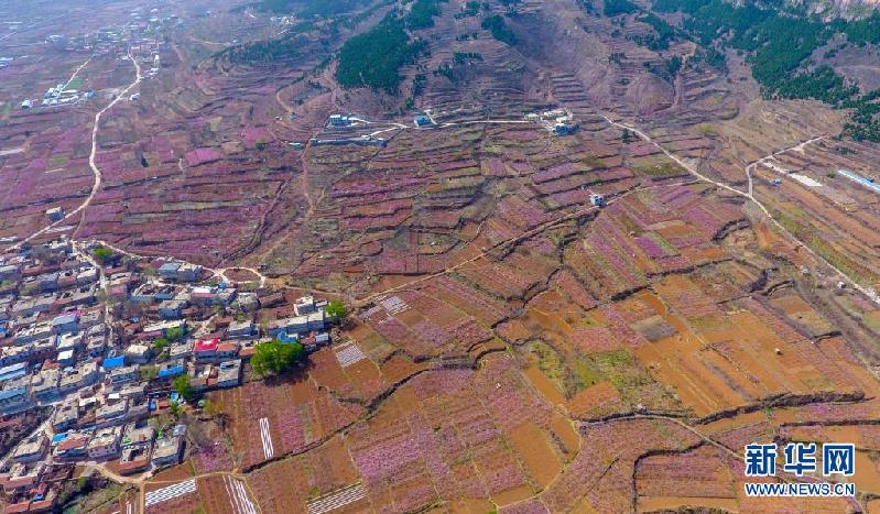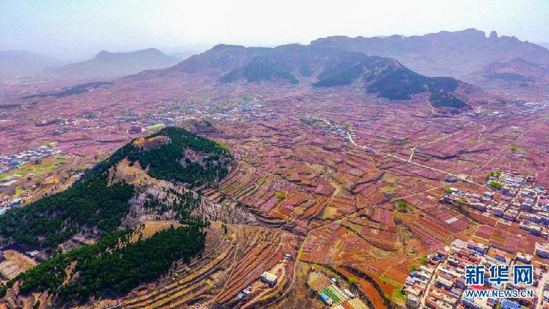 近日,位于山东省济南市仲宫街道的大片桃园进入盛花期,漫山遍野的桃花在春风中争相绽放。