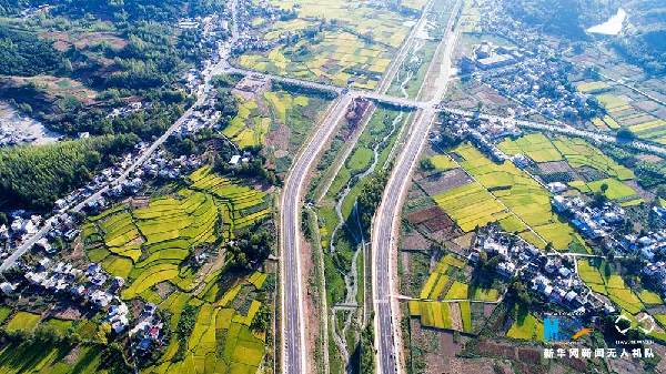 图为从空中俯瞰,十房高速穿过村庄田野,油菜花海,像一幅美丽的画卷。新华网发