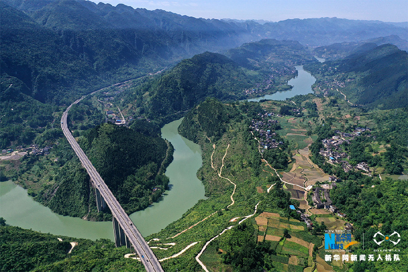 渝湘高速公路阿蓬江特大桥从大坪村穿过。新华网发(杨敏摄)