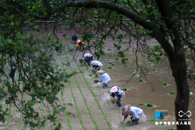 大坪村村民在稻鱼共生基地插秧。新华网发(杨敏 摄)