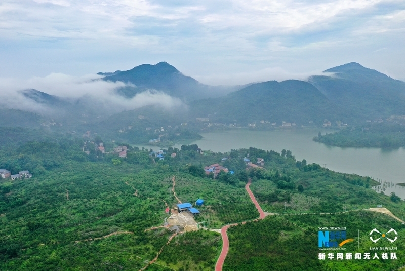 2021年6月30日, 华蓥市利用天池湖畔的石漠化土地发展起来的李子园,在云雾缭绕下显得郁郁葱葱(无人机航拍)。新华网发(邱海鹰 摄)