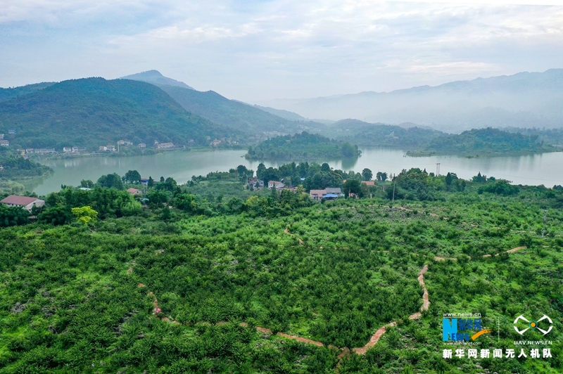 2021年6月30日, 在华蓥市航拍的利用天池湖畔石漠化土地发展起来的李子园一角。新华网发(邱海鹰 摄)