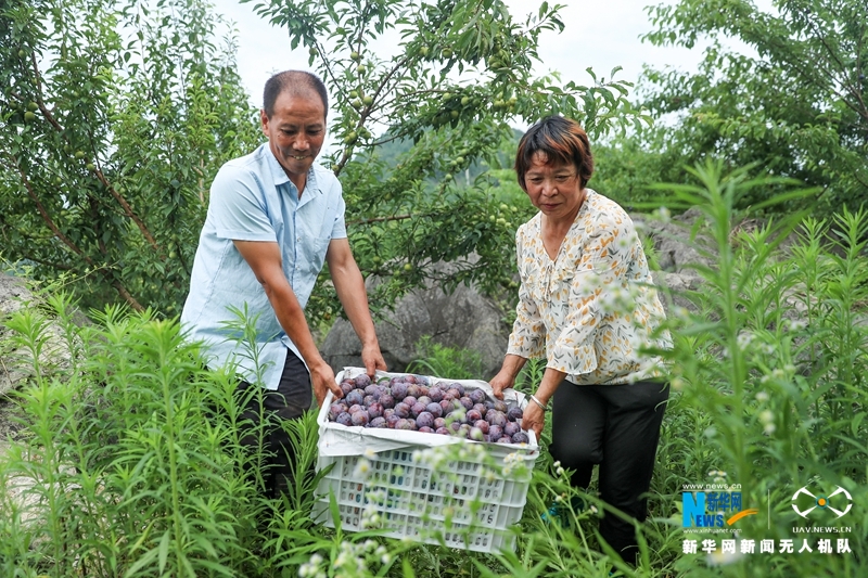 2021年6月30日, 华蓥市天池镇利用天池湖畔石漠化土地发展起来的李子园里,仁和村村民在采摘优质水果“青脆李”。新华网发(邱海鹰 摄)