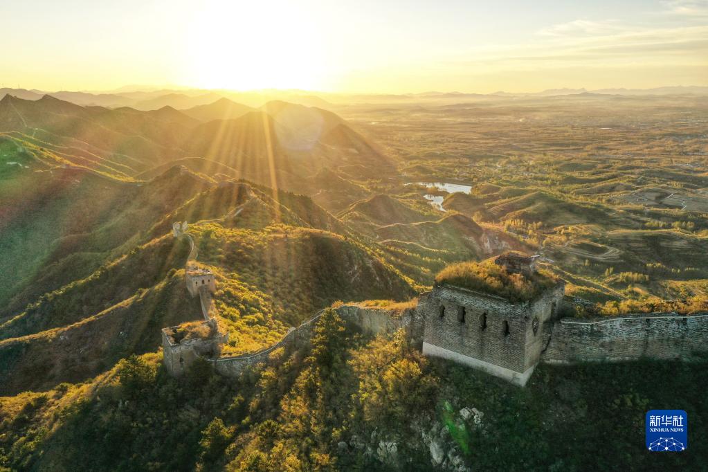 10月16日在河北迁安市境内拍摄的大理石长城日出景色(无人机照片)。