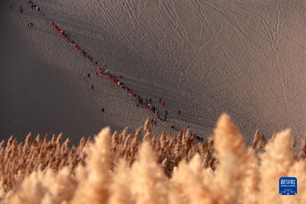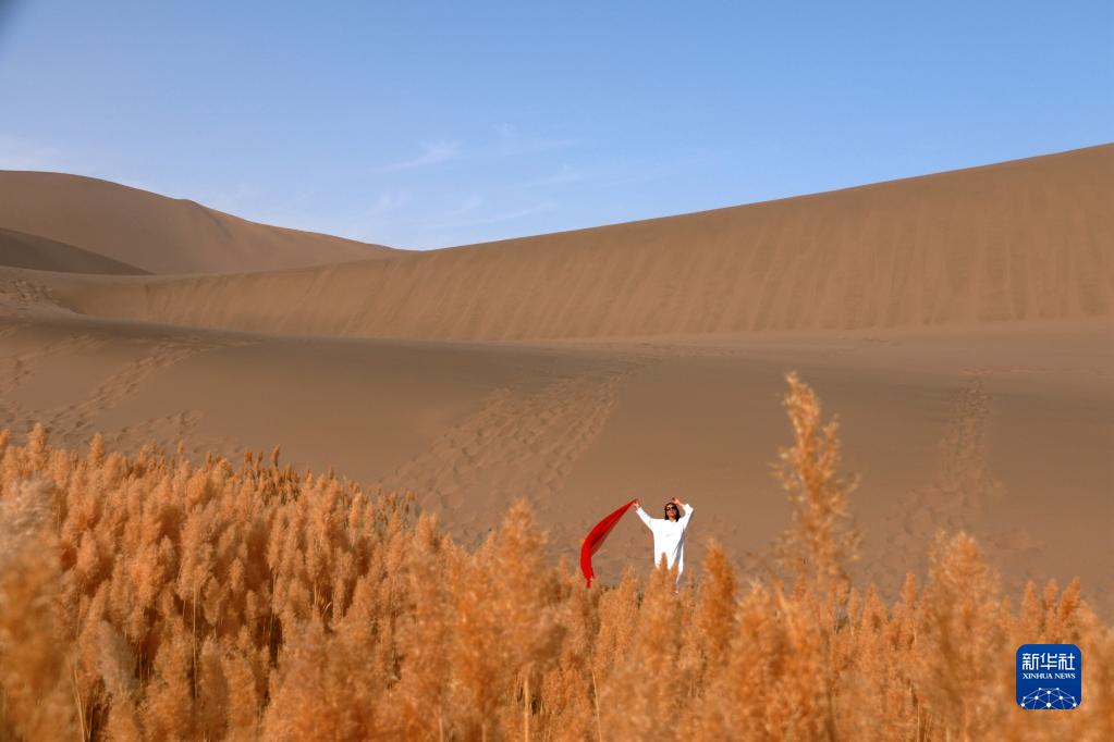 金秋时节,在甘肃省敦煌市鸣沙山月牙泉景区,大漠、驼队、蓝天、泉水、芦苇......构成一幅美丽迷人的画卷,吸引众多游客。新华社发(张晓亮摄)