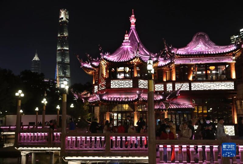 11月3日拍摄的上海豫园九曲桥的夜景。