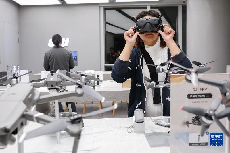11月3日,顾客在上?!癉JI|哈苏融合店”内体验飞行眼镜。