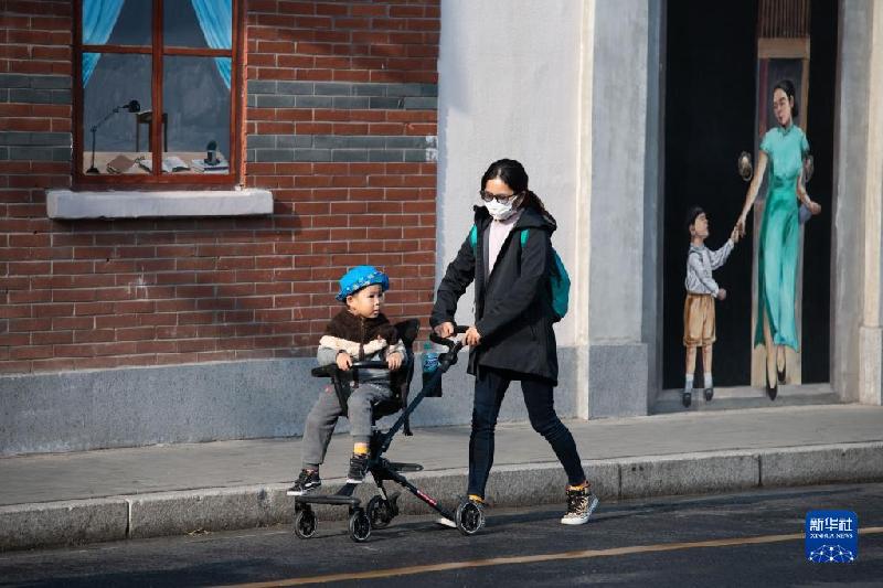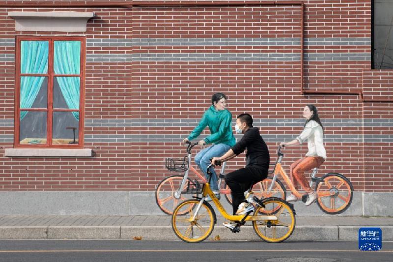 11月3日,在上海市静安区平德里,行人从墙绘作品前骑车经过。