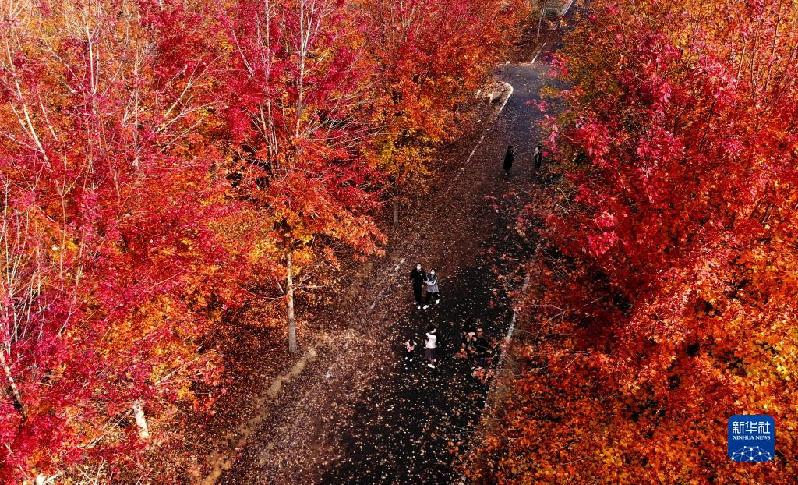 11月4日,游客在青岛西海岸新区张家楼街道张家楼村枫林赏景游玩(无人机照片)。