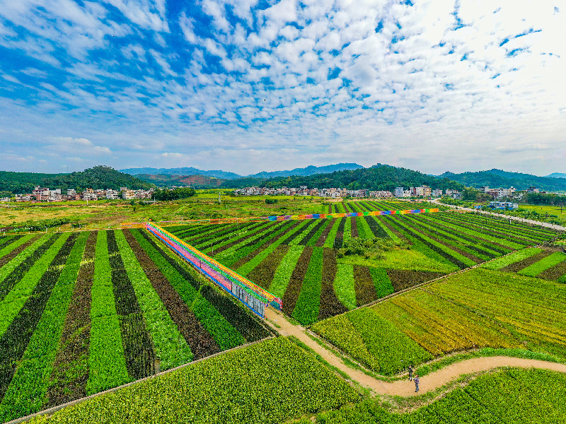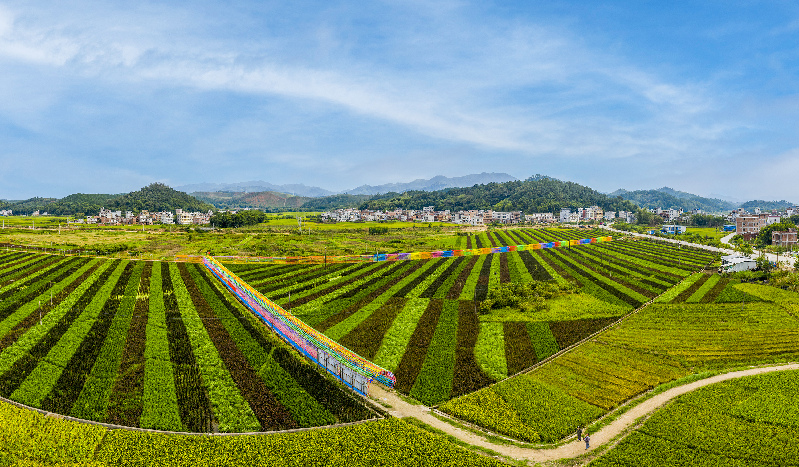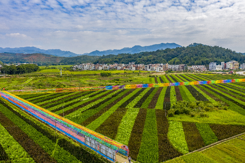 近日,广西梧州市龙圩区大坡镇新龙村和合垌村种植的五彩稻与农作物、村庄、远山等交相辉映,色彩斑斓。(何华文摄)