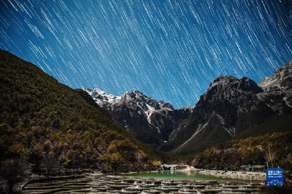 12月13日夜间在云南省丽江市玉龙雪山脚下拍摄的星轨(堆栈照片)。