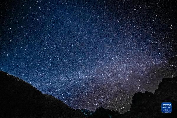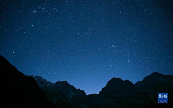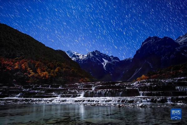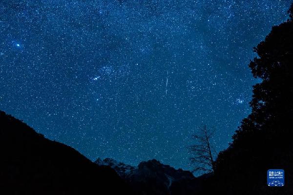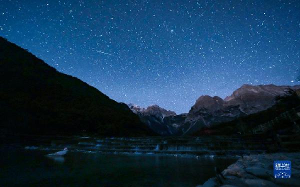 12月14日凌晨在云南省丽江市玉龙雪山脚下拍摄的双子座流星雨。