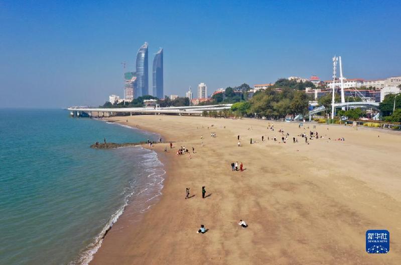 游客在厦门大学附近的白城沙滩游玩(12月12日摄,无人机照片)。