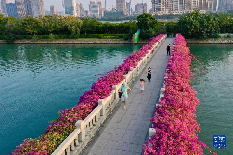 市民在厦门筼筜湖休闲步道上游玩(9月29日摄,无人机照片)。