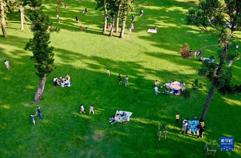 游人在厦门园林植物园草坪上享受休闲时光(10月5日摄,无人机照片)。