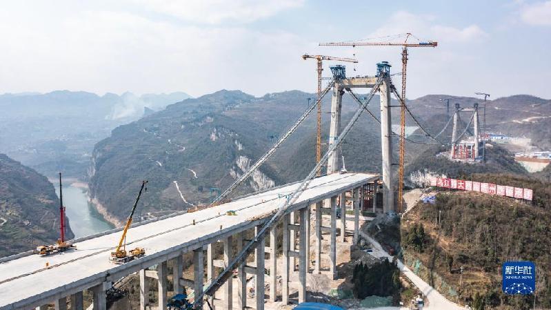 建设中的贵金古高速金烽乌江大桥(3月9日摄,无人机照片)。